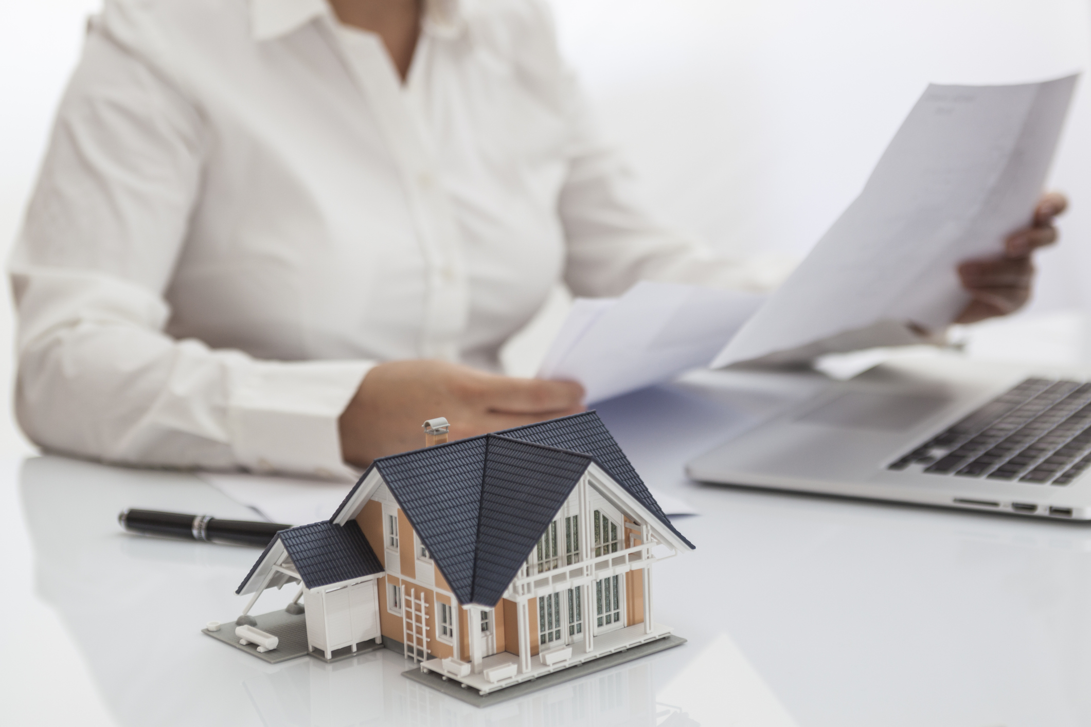 A woman working on a laptop at a desk with a house model, highlighting the advantages of real estate investment.